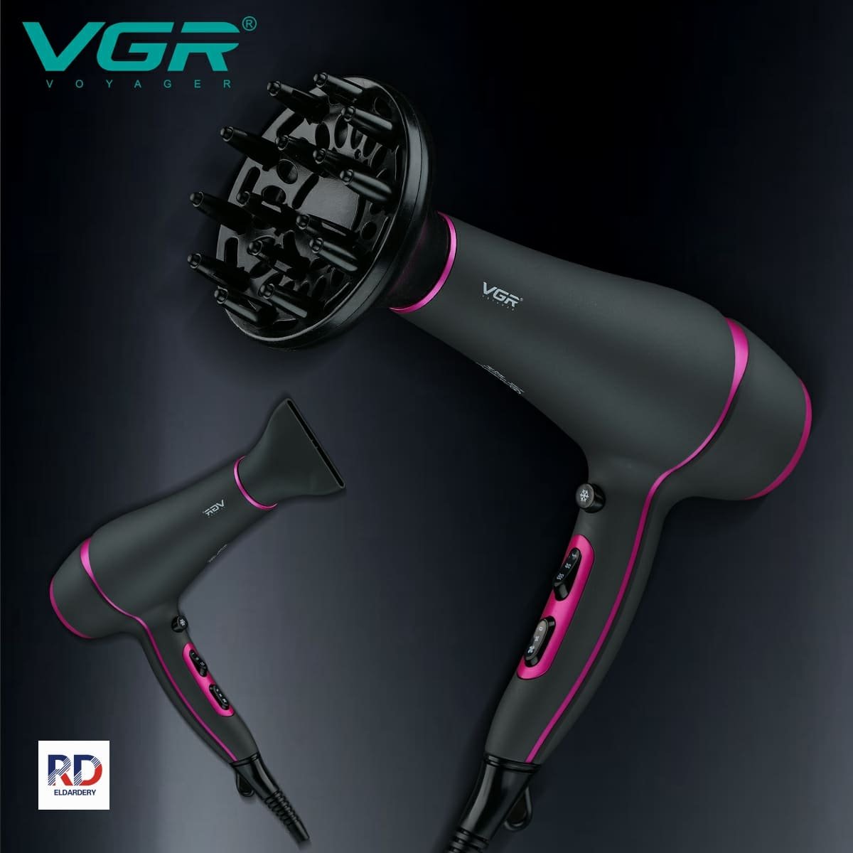 مجفف شعر VGR احترافي V-465 – قوة 2400 واط (أداء فعال)، 3 إعدادات حرارة، سرعتين، زر هواء بارد، تصميم معدني أسود أنيق